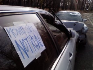 The story I heard when I arrived on set? A very concerned passerby had called the cops that morning thinking that the two wrecked cars we had on set was the scene of a real accident. Oh well, at least that means a big thumbs up for prod design well-done. ;)